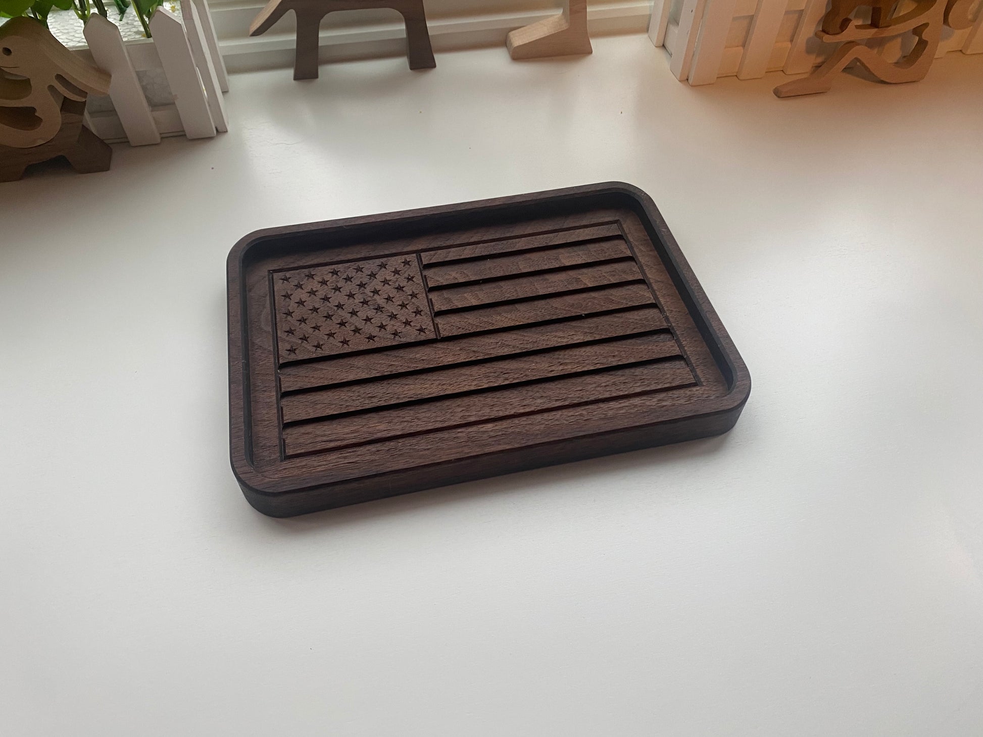 Celebrate the enduring spirit of America with our Patriotic Valet Tray, expertly handcrafted from rich, sustainably sourced walnut. Each tray features a beautifully carved American flag—bold stars and stripes that speak to our nation's pride, resilience, and unity.
